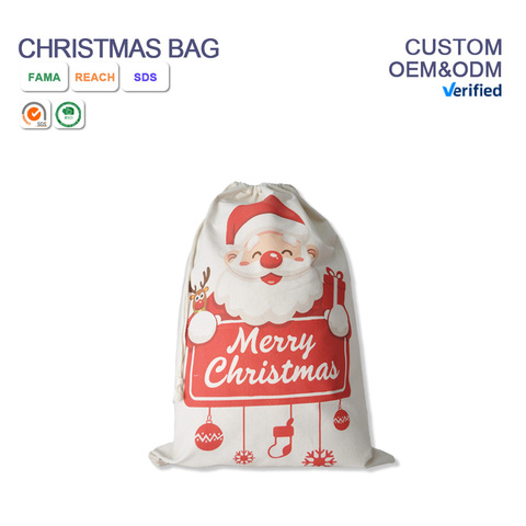 Decoración lienzo logotipo personalizado Santa impresión regalo de Navidad embalaje bolsa de algodón grandes bolsas de regalo de Navidad para supermercado